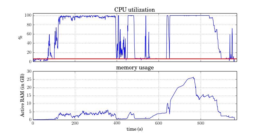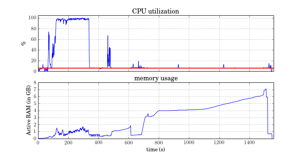 What follows is a memory mt. Everest climb in memory usage graph starting just after 500s. One can see the serial link stage running from 500s to 600s